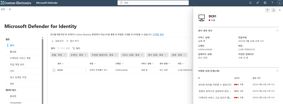 센서 설치가 완료되면 Defender 관리센터에서도 설치된 센서를 확인할 수 있습니다.