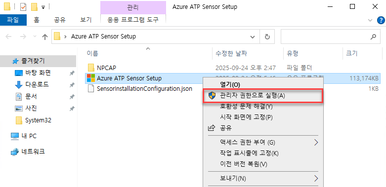 4-1. 관리자 권한으로 Azure ATP Sendor setup.exe 파일을 관리자 권한으로 실행하고 이후 나타나는 단계를 진행합니다.