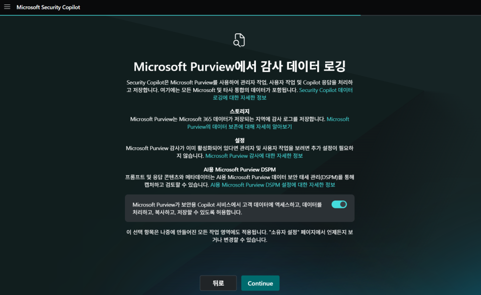 5. Microsoft Purview 에서 감사 데이터 로깅 화면에서 토글을 활성화 합니다.