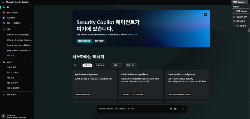 이후 Security Copilot 포탈을 확인할 수 있습니다. 여기까지 접근할 수 있다면 정상적으로 온보딩이 된 것입니다.