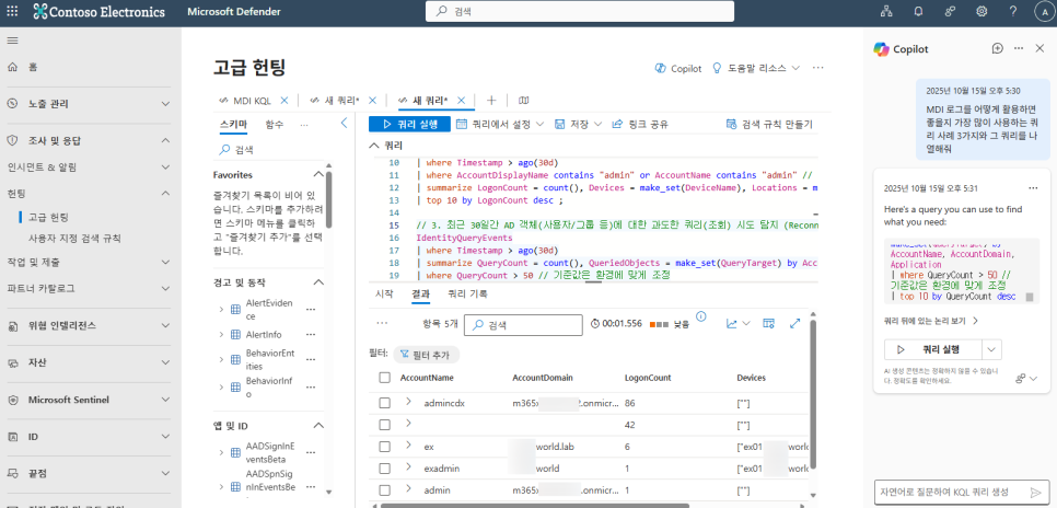 최근 보안 트렌드는 AI 자동화와 Zero Trust를 함께 적용하는 흐름으로 바뀌고 있으며 Copilot은 계정/디바이스/데이터 접근을 실시간으로 확인해 보안 운영을 더 효율적으로 만드는 방향으로 발전하고 있는데요, 보안 측면에서는 Defender/Entra/Intune/Purview 데이터를 함께 분석해 위협 징후를 빨리 발견할 수 있게 해주고 최소 권한 유지나 디바이스 보호 같은 대부분의 보안 요구사항을 지원합니다.