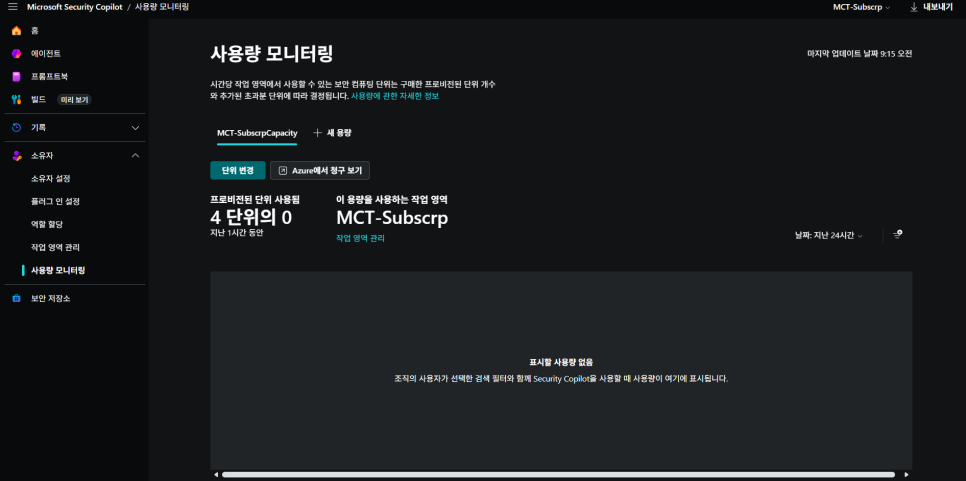 - 사용량 모니터링은 Security Copilot에서 구매한 보안 컴퓨팅 용량이 실제로 어떻게 사용되고 있는지 확인하는 메뉴입니다. 시간대별로 소비된 용량과 현재 연결된 작업 영역을 기준으로 Copilot 사용 현황을 조금이나마 시각적으로 확인할 수 있는데, 이 정보를 통해 용량이 부족한지, 과도하게 사용되고 있는지 여부를 판단할 수 있겠습니다.