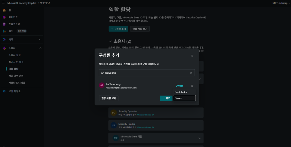 - 역할 할당은 Microsoft Security Copilot에 접근할 수 있는 사용자와 권한 수준을 제어하는 메뉴입니다. 사용자, 그룹, 또는 Microsoft Entra ID 역할을 추가해 소유자와 기여자 권한을 구분하여 부여할 수 있습니다. 여기서 설정된 권한에 따라 Copilot 사용 가능 여부와 관리 기능 접근 범위가 결정됩니다.