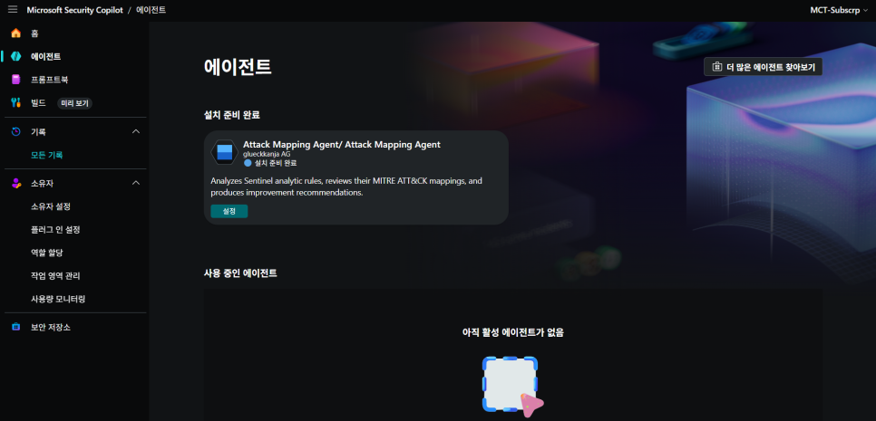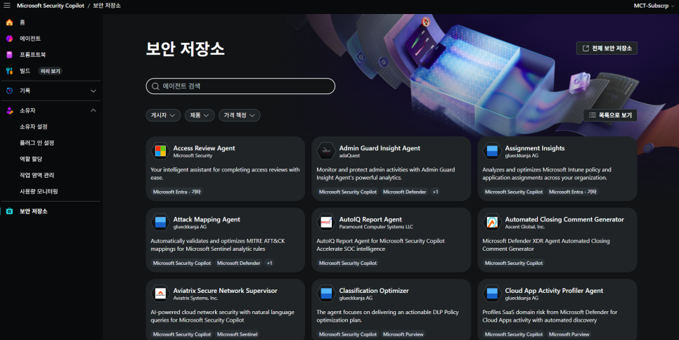 보안 저장소는 Microsoft Security Copilot에서 사용할 수 있는 에이전트와 확장 기능을 모아둔 카탈로그 영역입니다. Microsoft에서 제공하는 기본 에이전트와 파트너가 제공하는 에이전트를 검색하고 확인할 수 있습니다. 여기서 선택한 에이전트는 활성화 후 Copilot 분석이나 자동화 작업에 활용됩니다. 이 보안 저장소에서 추가한 에이전트는 "에이전트" 메뉴에서도 확인할 수 있습니다.