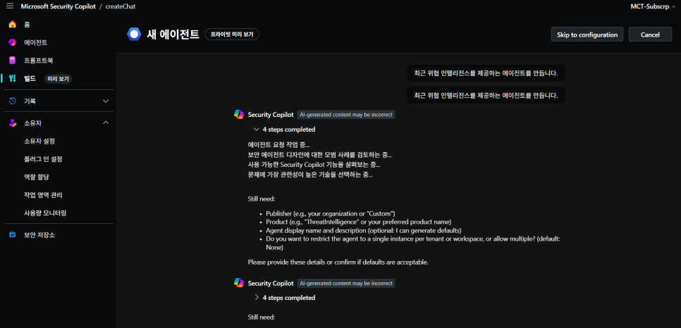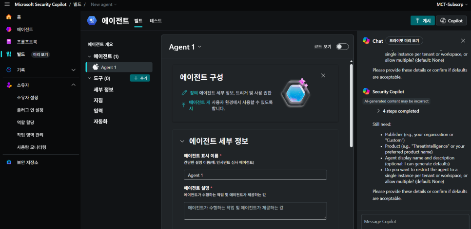 빌드는 Microsoft Security Copilot에서 에이전트를 직접 생성하고 구성하기 위한 메뉴입니다. 기본 제공 에이전트 사용이 아닌, 사용 목적에 맞게 에이전트를 정의하는 기능으로 보이고 현재는 미리 보기 상태로 제공되네요.