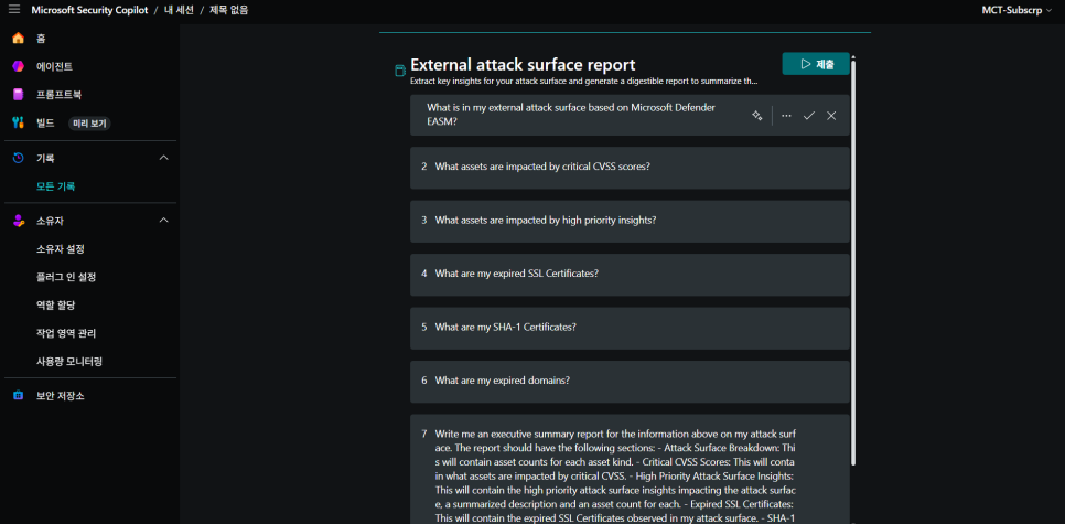 메뉴 구성을 살펴보고 Security Copilot이 실제 보안 업무에서 어떤 작업을 담당하는지 구조적으로 파악하여 각 기능을 용도에 맞게 보다 효율적으로 활용할 수 있겠습니다.