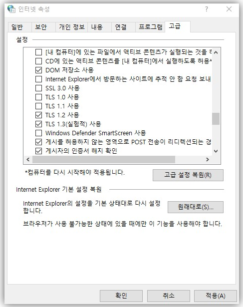 2. [고급] 탭에서 TLS 1.0, TLS 1.1 체크 해제 / TLS 1.2, TLS 1.3 체크 후 적용 클릭