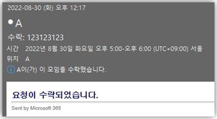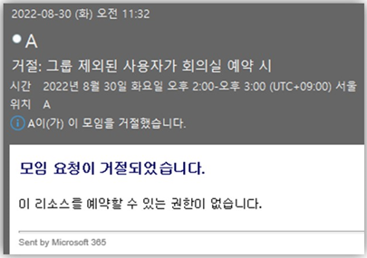 예약이 허용되지 않는 사용자가 회의실 예약 시 다음과 같은 반송 메일이 수신 됩니다.