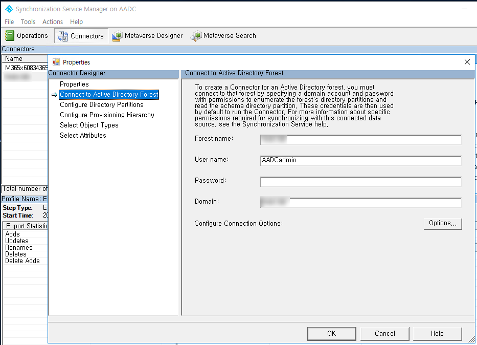 2. 또는 Synchronization Service Manager 실행 후 Connectors > DC > Properties > Connect to Active Directory Forest