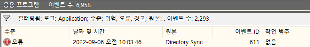 또한 AADC 서버 내 이벤트 로그에서 "611" 오류 코드의 이벤트가 같이 발생 됨을 볼 수 있습니다.