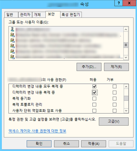 AD DS 커넥터 계정 확인 후 DC의 도메인 루트의 [속성] > [보안]에서 AD DS 커넥터 계정에 대해 다음 두 개의 권한을 허용 및 적용합니다.