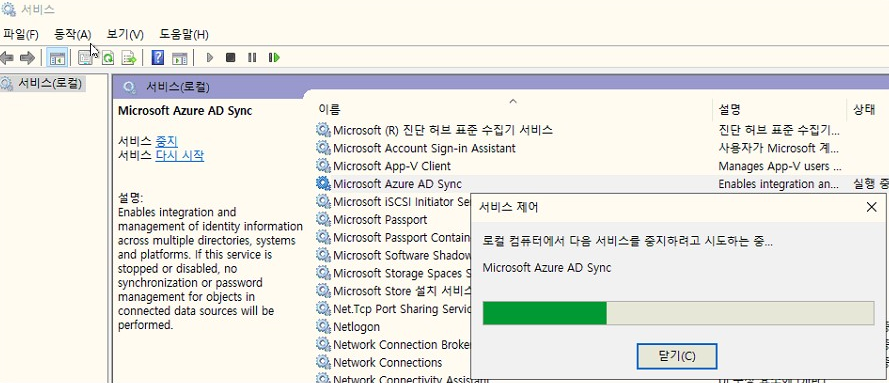 마지막으로 Service.msc 에서 Microsoft Azure AD Sync Service를 다시 시작 합니다.