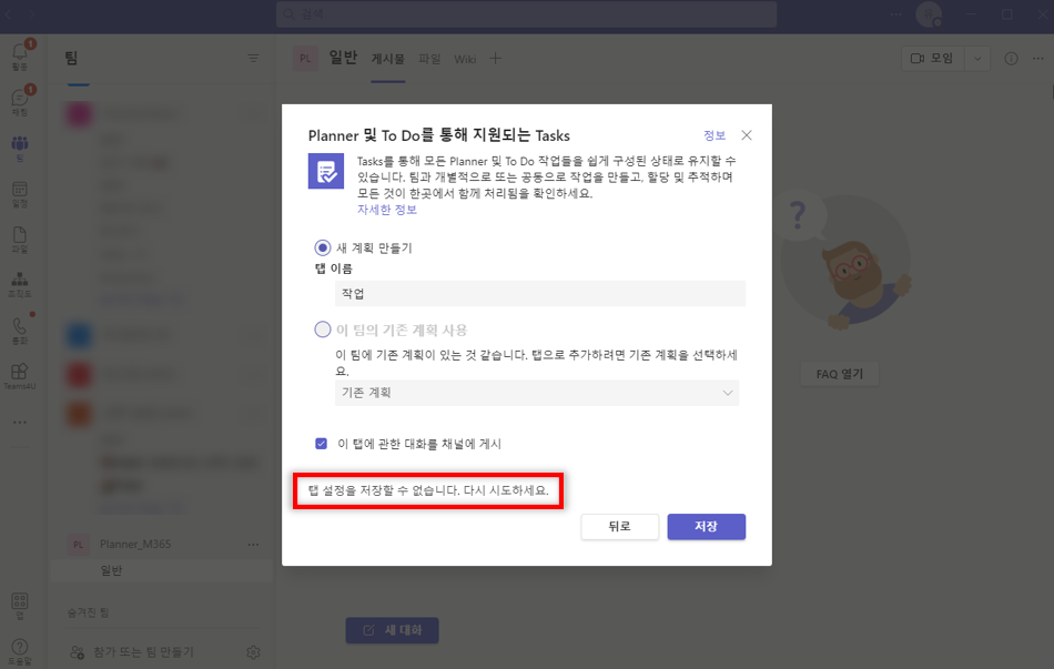 채널 상단의 탭에서 "Planner 및 To Do를 통해 지원되는 Task" 앱을 추가하려할 때 다음과 같이 오류가 발생하는 경우 입니다.