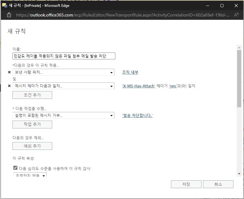 [Exchange Online] 민감도 레이블이 적용되지 않은 파일 첨부 시 발송 차단 규칙 만들기 본문