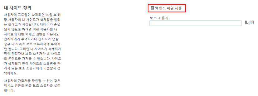 5. [내 사이트 정리] 옆에 "액세스 위임 사용"이 체크되어 있는지 확인합니다.