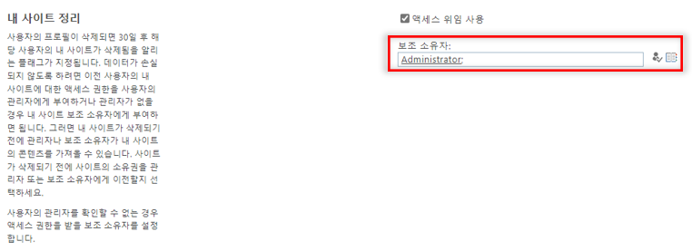 ※ Azure AD에서 A 사용자 계정에 관리자가 지정된 경우 이 관리자는 A 계정이 삭제되는 시점으로부터 자동으로 A 계정의 OneDrive 액세스 권한을 갖게 됩니다. 만약 관리자가 지정되지 않은 경우 보조 소유자를 추가하여 액세스 위임을 관리할 수 있습니다.