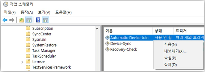 - 작업 스케쥴러 > Microsoft > Windows > Workplace Join > Automatic Device Join “사용” 클릭
