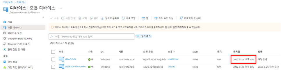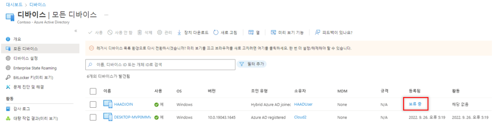 1. Azure AD Connect Sync로부터 디바이스에 대한 동기화 시작 시점이 얼마 지나지 않아 Azure AD에서 해당 장치를 보류 중인 장치 개체로 인식하여 만든 경우 (이 경우, 시간이 지나면 디바이스 상태는 자동으로 정상 변경됨)