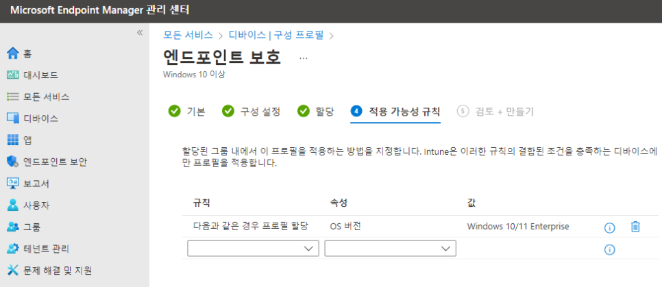 1. MEM 관리센터 > 디바이스 > 구성 프로필 > 프로필 만들기 > Windows 10 이상 > 템플릿 > 엔드포인트 보호
