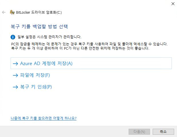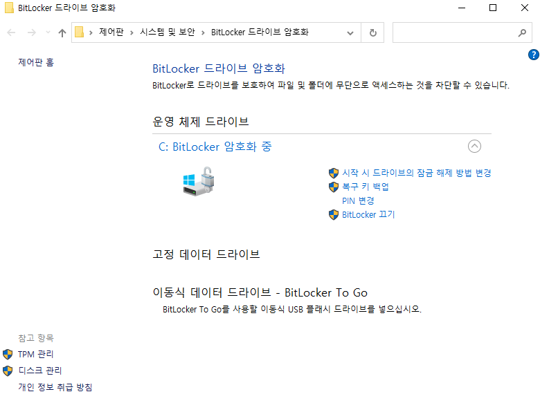 BitLocker 관리에서는 아래 내용을 확인할 수 있었습니다.