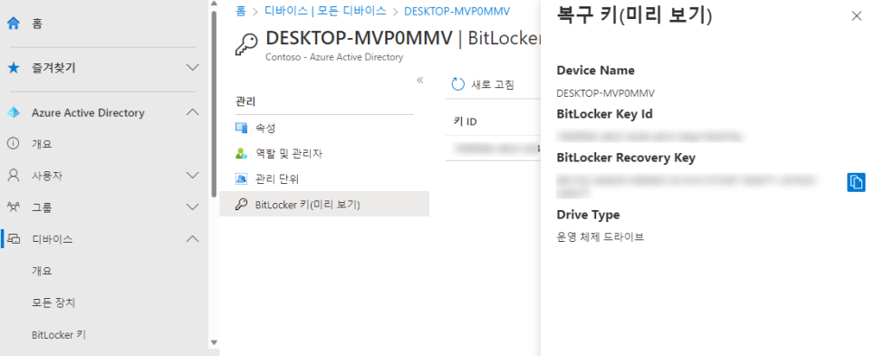 Azure AD에 복구 키를 백업하였기에 [Azure AD 관리센터] > [디바이스]에서 해당 디바이스의 Bitlocker 복구 키 확인이 가능합니다.
