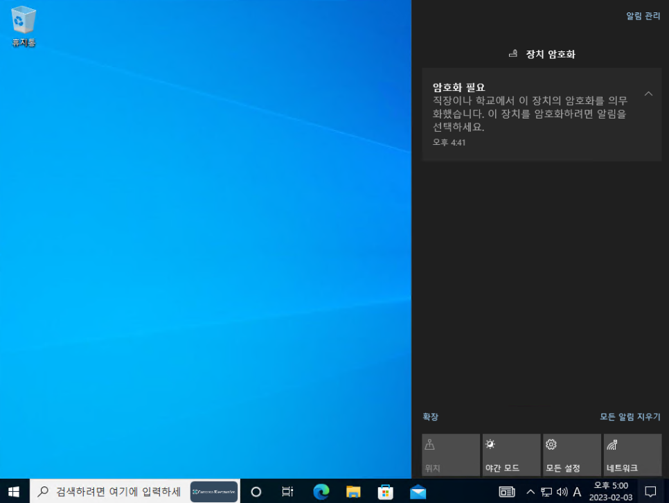 - 디바이스에 로그인 시 우측 하단 배너에서 "암호화 필요. 직장이나 학교에서 이 장치의 암호화를 의무화했습니다. 이 장치를 암호화하려면 알림을 선택하세요." 알림을 볼 수 있습니다.