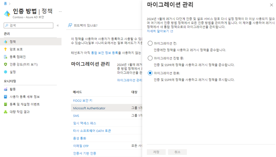 ※ 중요 - 마이그레이션 완료 상태로 변경 전 레거시 MFA 및 SSPR 인증 방법을 비활성화 시켜야 합니다.