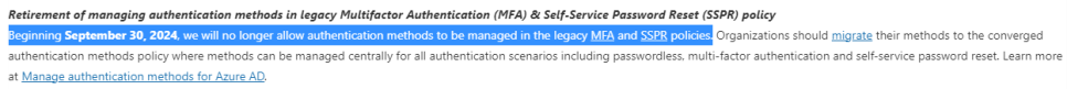 TaylorAn 2023. 9. 12. 10:24Microsoft로부터 2024년 9월 30일 이후 레거시 MFA(다단계 인증) 및 SSPR(셀프 서비스 암호 재설정) 정책에서 인증 방법 관리 지원 만료(종료?ㅎㅎ)에 대한 내용이 techcommunity blog에 공지 되었습니다. MFA 및 SSPR 인증 방법 관리가 나눠져 있다가 한 곳에 모여지는 것을 보면 마이그레이션 + 통합 관리와 같은 개념으로 이해됩니다.