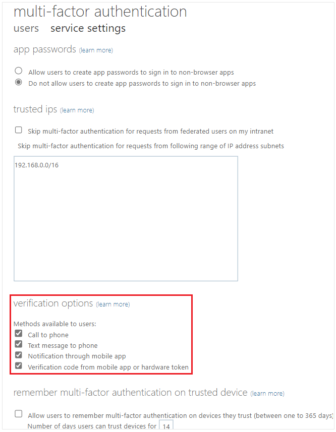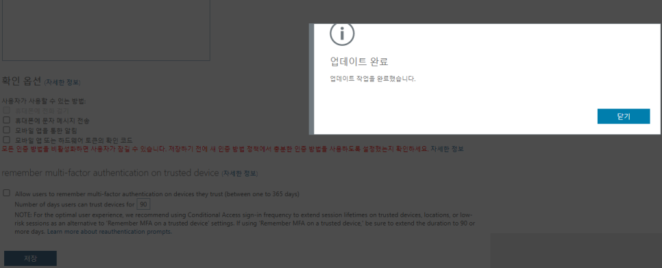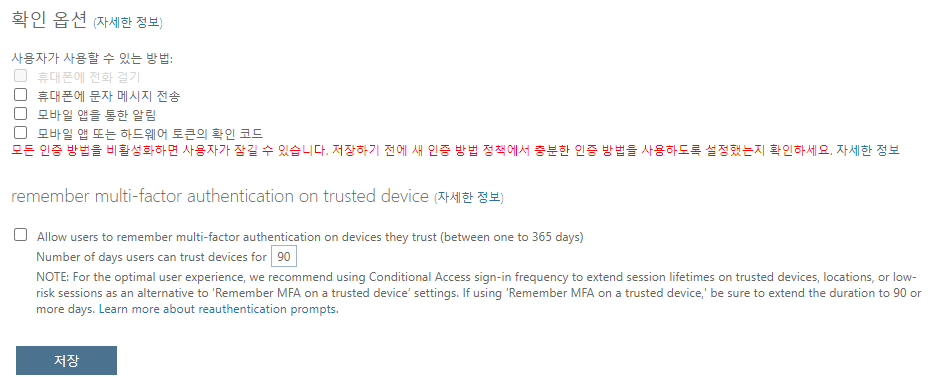 - Azure Active Directory 관리센터 > 사용자 > 모든 사용자 > 사용자별 MFA > 서비스 설정 > 확인(인증) 옵션