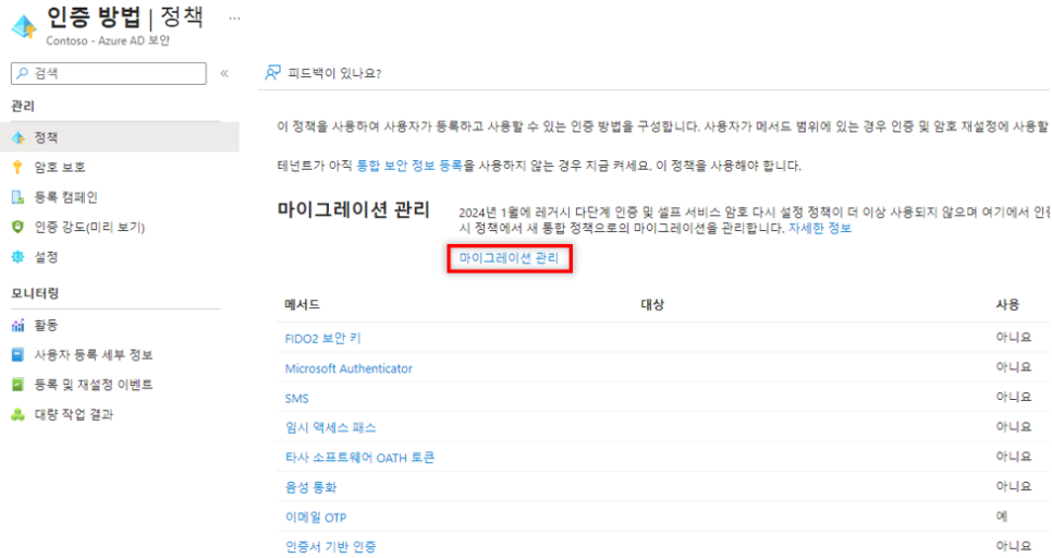 - Azure Active Directory > 보안 > 인증 방법 > 정책 경로로 이동하여 "마이그레이션 관리" 를 클릭합니다.