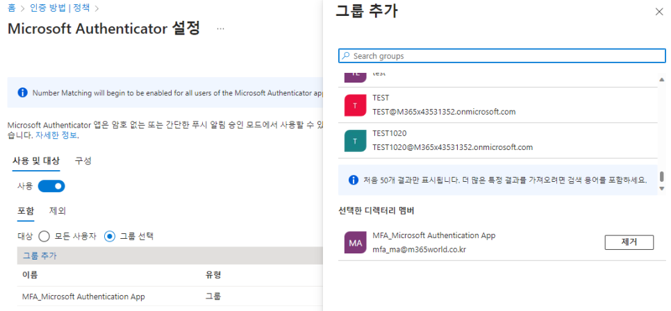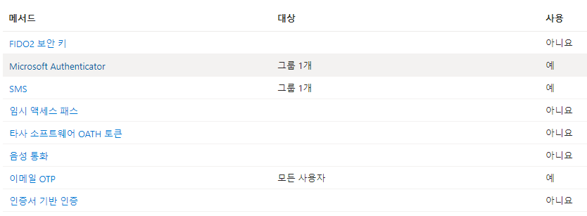 ※ 새로운 Azure AD 인증 방법 정책에서는 각 인증 방법에 대해 모든 사용자 또는 특정 그룹을 대상으로 옵션을 설정할 수 있습니다.