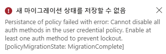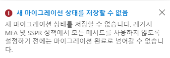 "새 마이그레이션 상태를 저장할 수 없습니다. 레거시 MFA 및 SSPR 정책에서 모든 메서드를 사용하지 않도록 설정하기 전에는 마이그레이션 완료로 넘어갈 수 없습니다."