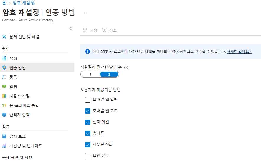 - Azure Active Directory 관리센터 > 암호 재설정 > 인증 방법