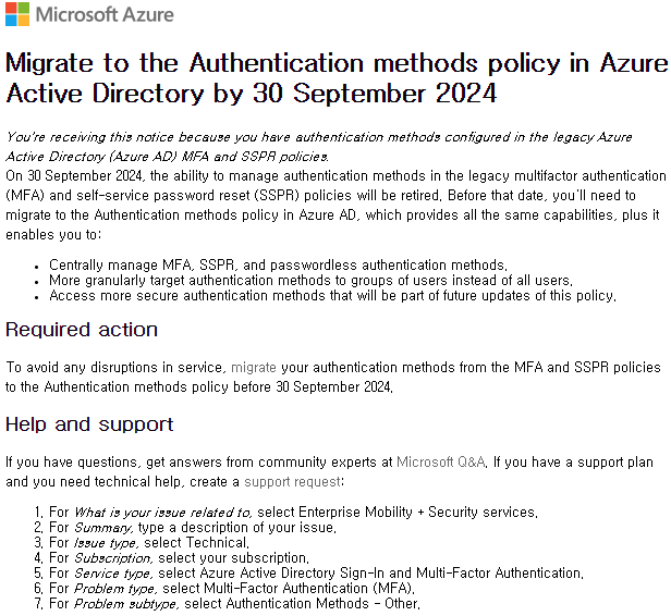 당장 마이그레이션을 진행해야 하는 것은 아니지만 레거시 MFA 및 SSPR을 사용하고 있는 환경은 이후 마이그레이션을 위해 현재 설정된 MFA 및 SSPR에 대한 인증 방법/적용 대상을 미리 파악하고 기록해두는 것이 좋겠습니다.