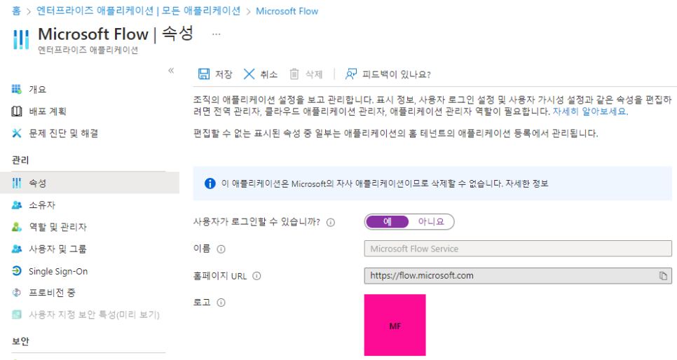 원인은 테넌트에서 마지막 Flow 라이선스(또는 Flow를 포함하는 Office 라이선스)가 만료되는 경우 이로 인해 엔터프라이즈 애플리케이션 목록 중 Microsoft Flow 서비스에 대한 액세스가 자동으로 비활성화되어 오류가 발생한다고 합니다.