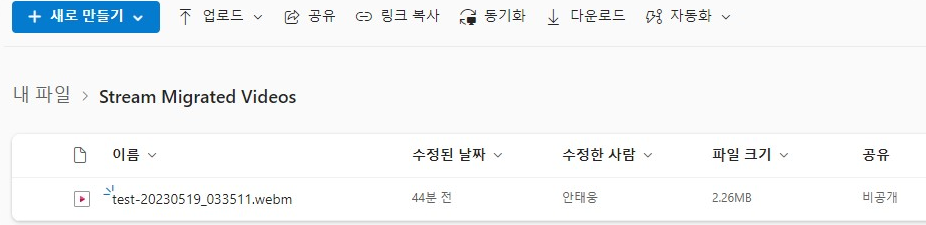 6. 마이그레이션이 완료되면 사용자의 OneDrive에서 Stream Migrated Videos 폴더가 자동으로 생기며, 해당 폴더 안에 파일이 마이그레이션 된 것을 확인 할 수 있습니다.