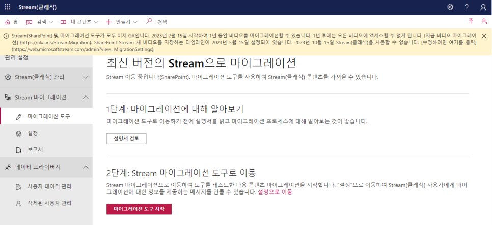 먼저 Stream(Classic)에서 Stream(SharePoint) 마이그레이션에 대해 기술된 개요 및 내용을 확인하시기 바랍니다.