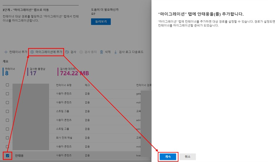 3. 마이그레이션 대상으로 이동 시키려는 컨테이너를 선택 한 후 상단의 [마이그레이션 추가] > [계속]을 클릭합니다.