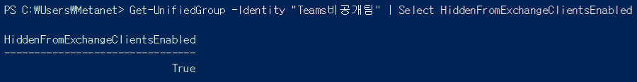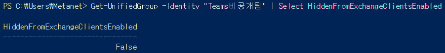 Set-UnifiedGroup -Identity "Teams비공개팀" -HiddenFromExchangeClientsEnabled:$False