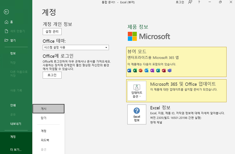 - [파일] > [계정] 아래의 제품 활성화 버튼은 Office가 뷰어 모드일 때 숨겨집니다