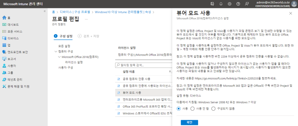 2. [컴퓨터 구성] > [Microsoft Office 2016(컴퓨터)] > [라이선스 설정] > [뷰어 모드 사용] 을 사용으로 설정하고 프로필을 생성하여 정책 배포 대상 그룹에 프로필을 할당합니다.