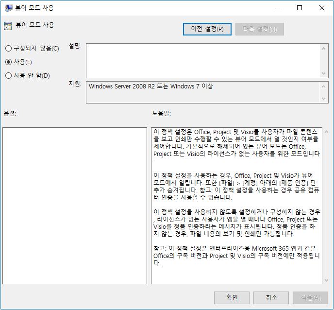 2. 그룹 정책 편집기에서 [컴퓨터 구성] > [관리 템플릿]> [Microsoft Office 2016(컴퓨터)] > [라이선스 설정] > 뷰[어 모드 사용] 으로 이동하여 "사용"으로 설정 및 적용합니다.
