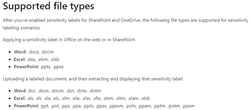 6. SharePoint의 민감도 레이블에서 지원하는 파일 형식은 아래와 같습니다.