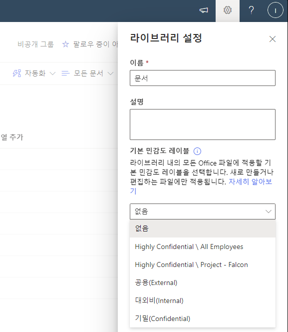 1. SharePoint 사이트 라이브러리에 사용할 민감도 레이블 생성