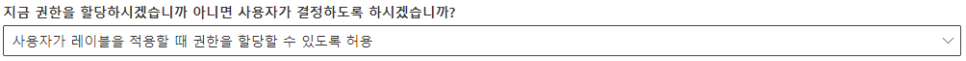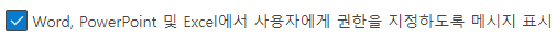 - "사용자가 레이블을 적용할 때 권한을 할당할 수 있도록 허용" 옵션 및 "Word, PowerPoint 및 Excel에서 사용자에게 권한을 지정하도록 메시지 표시" 확인란이 선택되어 있습니다. 이 설정은 "사용자 정의 권한"이라고도 합니다.