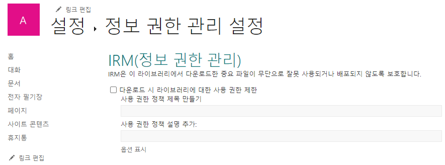 4. SharePoint 라이브러리에 대해 IRM 설정이 활성화 되어 있는 경우 호환되지 않으니 IRM 설정을 비활성화 해야 합니다.