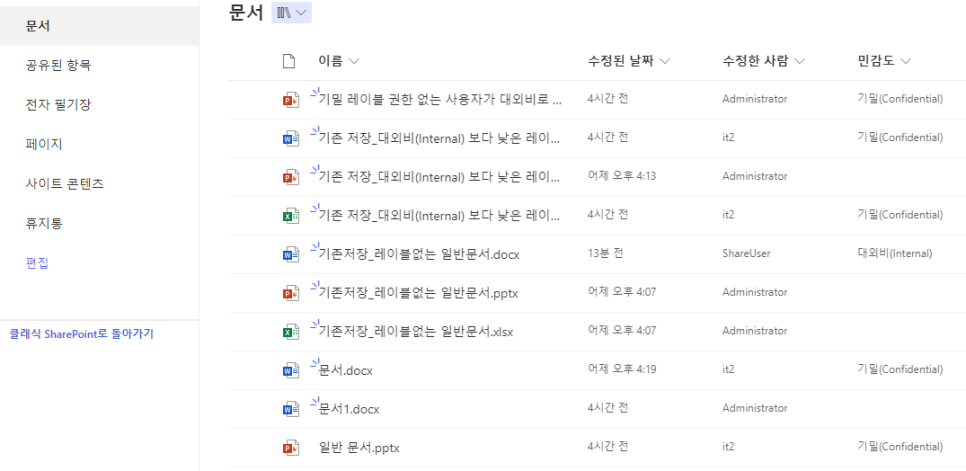 5. 웹에서 새로 생성한 문서에대해서는 민감도 레이블 열에서 즉시 민감도 레이블 명을 확인할 수 있으며 기존에저장되었거나 업로드 된 문서는 편집 등의 액션이 있는 경우 민감도 레이블이 적용되는 것을 확인할 수 있습니다.