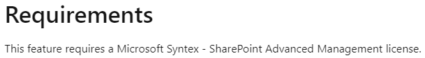 이 기능 사용을 위해서는 Microsoft Syntex - SharePoint Advanced Management (SAM) 라이선스가 필요하다고 하는데 Demo 테넌트에서는 SAM 라이선스가 없어도 사용 가능하네요. 이 부분은 Demo 테넌트라서 가능하거나 또는 다른 Product 환경에서도 사용이 가능하더라도 추후 SAM 라이선스가 없는 경우 기능 사용 제한이 발생할 수 있으니 참고해주세요.