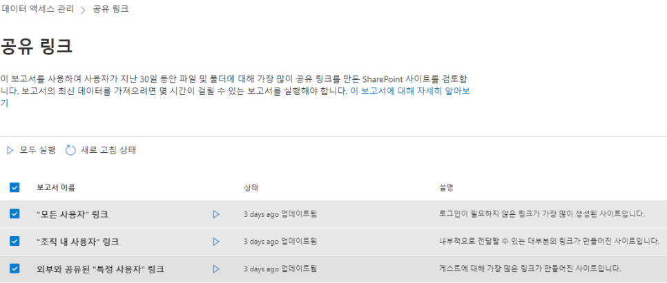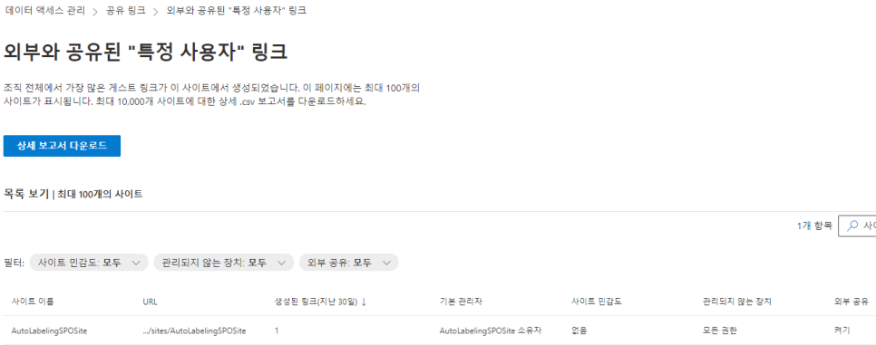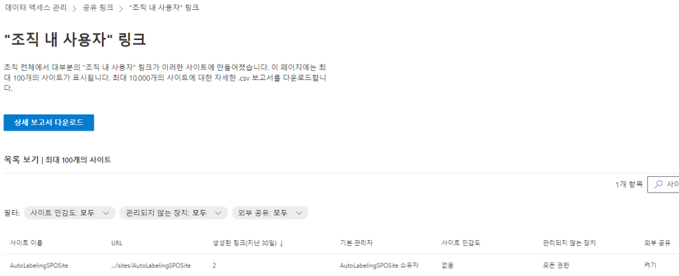 ※ 공유 링크에 대한 보고서, 민감도 레이블이 적용된 파일이 저장된 사이트에 대한 보고서를 확인할 수 있습니다.