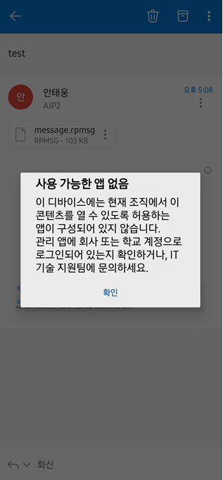 저의 경우 AIP 레이블이 적용된 전자 메일을 Outlook 모바일 앱에서 읽어 올 때 위 팝업이 나타났습니다.